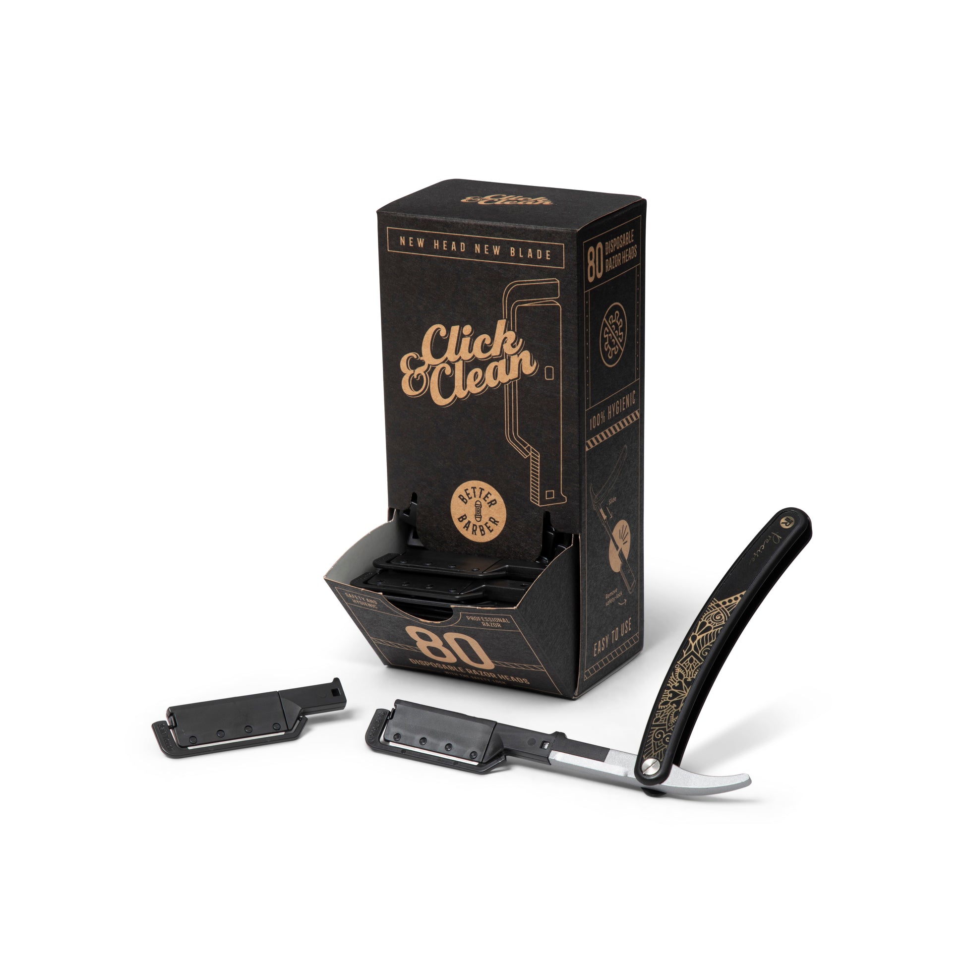 BETTER BARBER CLICK & CLEAN RAZOR HANDLE W/80 HEADS