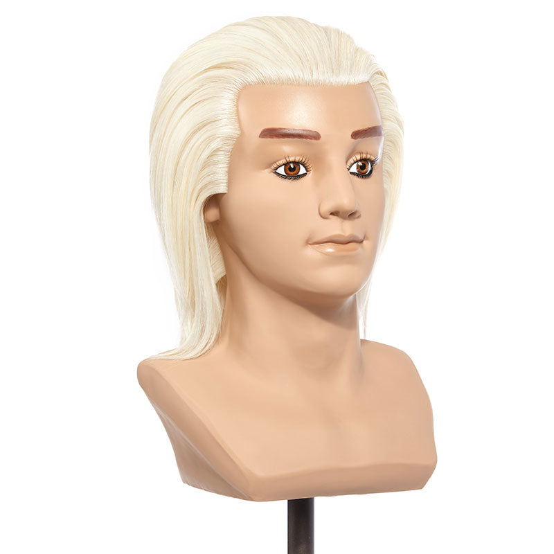 OMC-certified mannequin; goat white hair that is specifically designed for men's sculpture, color and perming techniques.